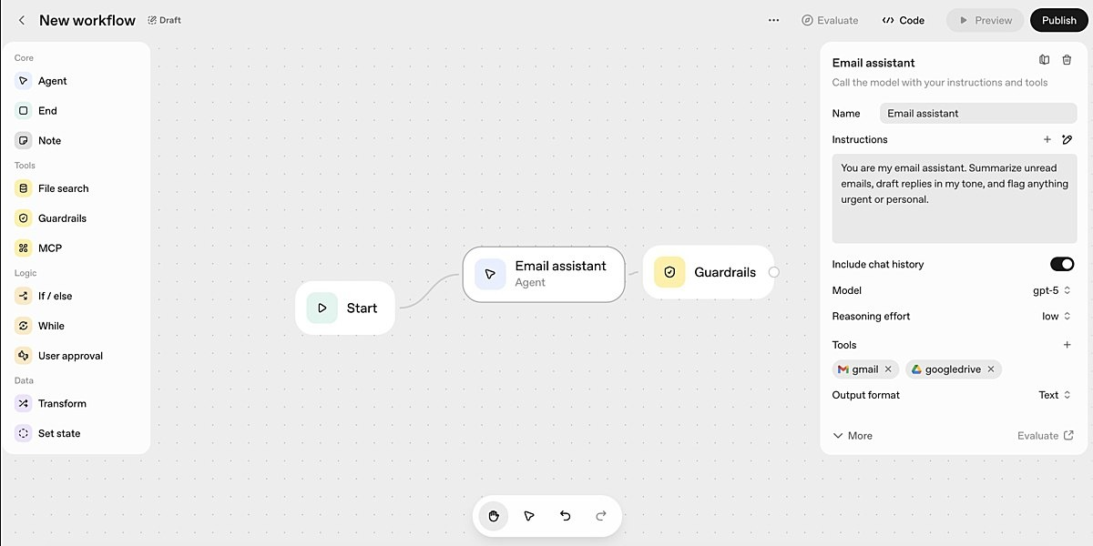 - Agent Builder: визуальный canvas (drag-and-drop) для создания сложных рабочих потоков с агентами, версиями, ветвлениями.